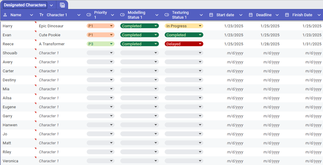 This is the sheet that keeps everyone on the team organised, once a character has been modelled one of the leads will change the status as required. It’s also a good idea to showcase start dates, deadlines and finish dates for future reference